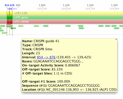 对于具有多个脱离目标位点的CRISPR guide,只有前五位将列在工具提示中。此信息也可以从“ 注释”选项卡查看,排序和导出。